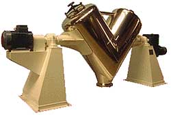 V-blenders consist of two cylindrical sections joined at an angle of around 90o. The mixer is rotated about a horizontal axis, with mixing resulting from the tumbling motion of the particles. Internal baffles are sometimes used to improve mixing performance. V-blenders are designed for batch operation.